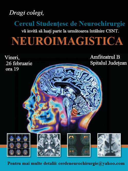 Cercul Studențesc de Neurochirurgie din Timișoara vă invită să luați parte la următoarea întâlnire CSNT, cu tematica "Neuroimagistică" care se va desfășura în data de 26 februarie a.c., în Amfiteatrul B al Spitalului Clinic de Urgență "Pius Brânzeu" din Timișoara.